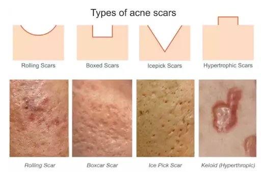 Boxcar Scars: Broad, oval or round depressions with sharp vertical edges. They resemble chickenpox scars and respond well to resurfacing lasers and dermal fillers.